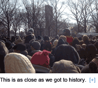 So we did the only thing we could. We waited. We chatted to the other people in line around us. We stomped our feet and practiced our salsa steps and shouted "woo-woo-woo!" and "O-ba-ma!" to stay warm. And as the hours until the ceremony turned into minutes, we hoped and prayed that the huge crowd behind us didn't decide to make a frantic push for the exit.