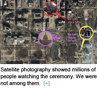Day One of the new administration, and we have our first media conspiracy. The Washington Post is grossly underreporting the number of legitimate ticket-holders who were denied entry into the inauguration. The article claims approximately 4,000 people were turned away at the Purple Gate, but there were many times that number around us and behind us when the gate clanged shut minutes before noon. Beyond it, we could see the empty Capitol lawn where we were supposed to be standing.